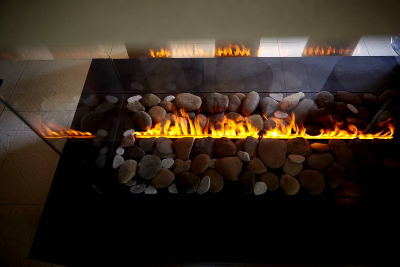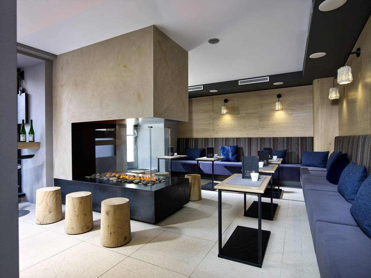 - Fireplace lounge with electric fireplace and corner benches
